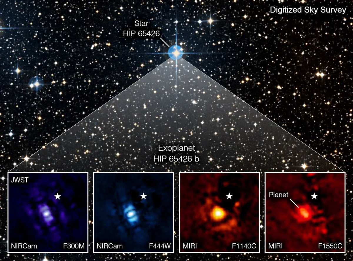 This image shows the ExoPlanet HIP 65426 b in different bands of infrared light, as seen from the James Webb Space Telescope.